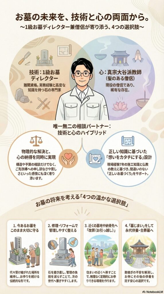 光徳石材では、1級お墓ディレクターとしての専門知識と、真宗大谷派教師としての立場の両方を踏まえて、ご相談をお受けできます。