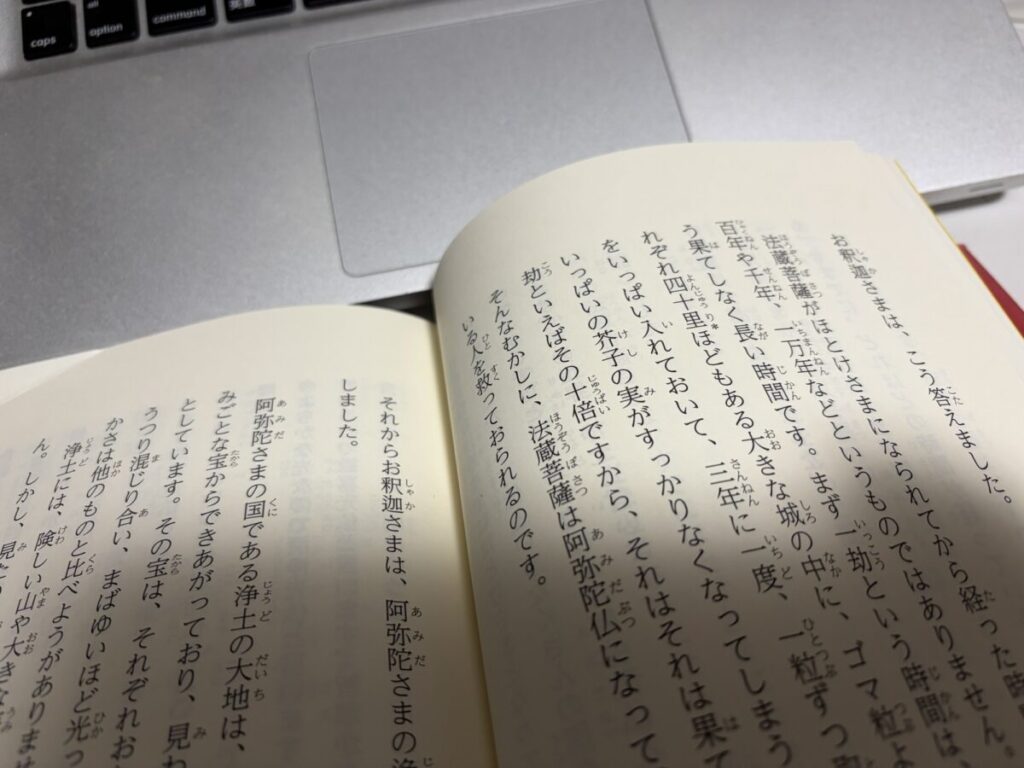 今回は、浄土真宗の根幹である『大無量寿経(だいむりょうじゅきょう)』を、子供にも分かりやすい言葉で綴られた聖典を通して読み解きました。