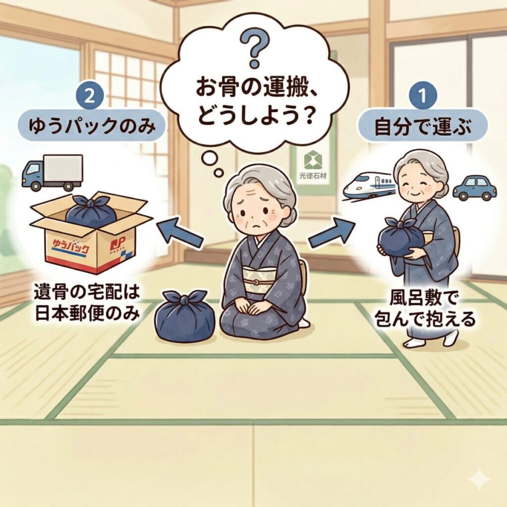 結論から申し上げますと、ご自身でご遺骨を運ぶことは全く問題ありません。 失礼にあたることもありませんので、ご安心ください。 むしろ、ご家族の手で大切に抱えてお引越しをすることは、ご先祖様への何よりの供養になります。公共交通機関(新幹線や飛行機など)や自家用車で運ばれる方は多くいらっしゃいます。